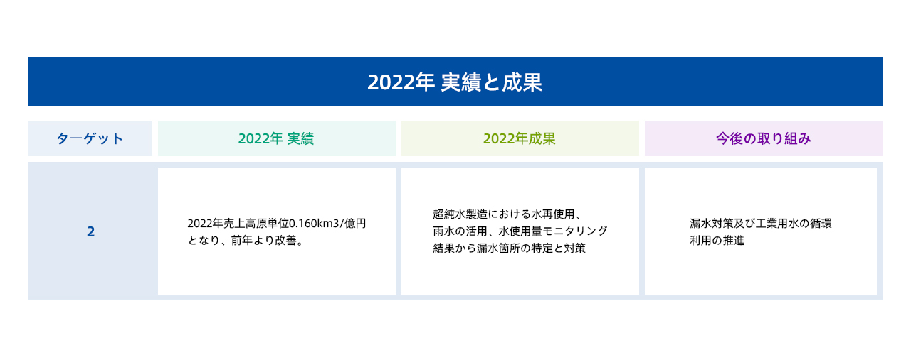 グループ内事業活動における水の使用量を最大限合理的なものとし、水使用原単位で前期値を超えないようにします。